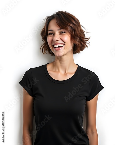 Joyful Woman in Black T-Shirt, Studio Portrait, Happy Expression, White Background, Smiling Face, Casual Wear, Short Hair