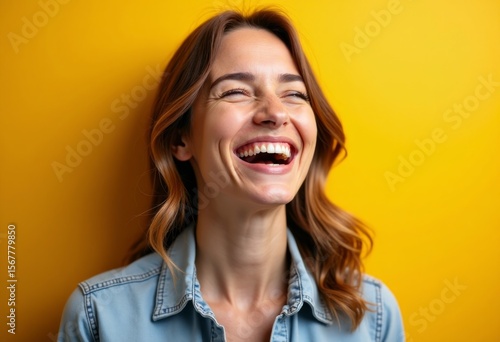 Joyful woman laughing against bright yellow background