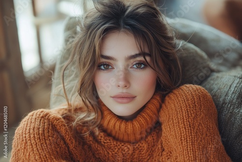 Joyful woman laughing at home in cozy burnt orange sweater during winter