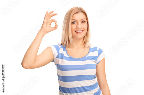 Joyful woman making OK sign with her hand
