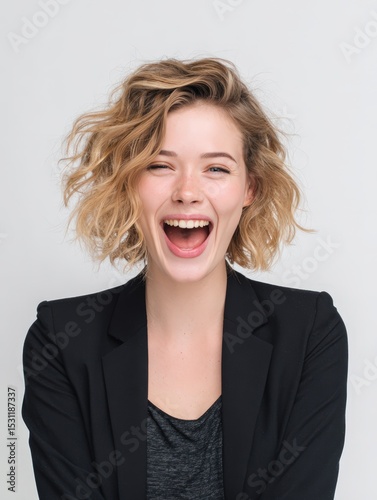Joyful woman portrait. Happy, smiling, laughing expression. Ideal for websites, social media, and advertising.