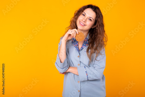 Joyful woman wears fashion pajama going to eat delicious cookie on yellow background with copy space. Morning, breakfast and home wear concept.