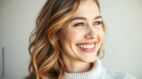 Joyful woman with wavy hair in a cozy sweater, radiating happiness and warmth against a light backdrop