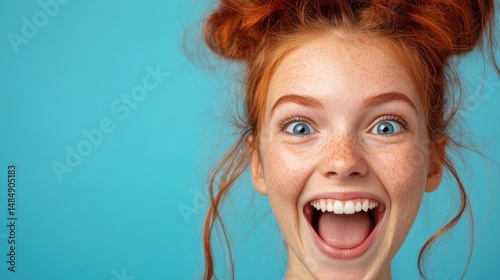 Joyful young caucasian female with red hair expressing excitement on a blue background