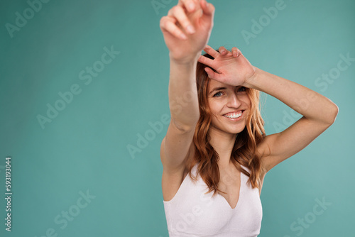 Joyful young excited woman wearing a white shirt. Happy and smiling cheerfully ginger hair woman portrait over mint studio background. Confident fit female. Happiness and lifestyle people.