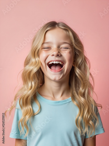 Joyful Young Girl with Blonde Wavy Hair Laughing Against Pink Background