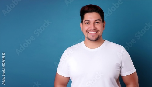 joyful young hispanic plus size body positive male man boy guy 30s in white blank design casual t-shirt posing color background studio portrait