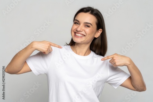 Joyful Young Woman Smiling Enthusiastically While Pointing at Her White T-Shirt