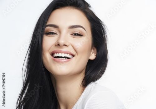 Joyful young woman with a radiant smile and dark hair on a pristine white background