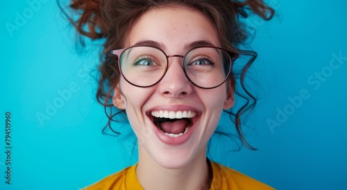 Joyful young woman with curly hair and glasses
