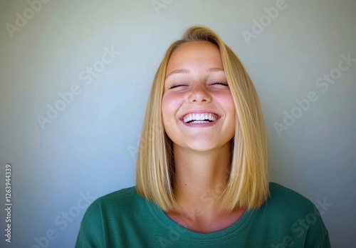 Joyful Young Woman with Short Hair Laughing Against Simple Background