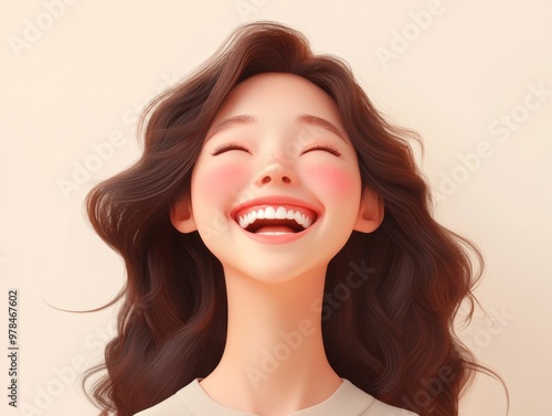 Joyous Asian Girl 3D Cartoon Illustration, Smiling