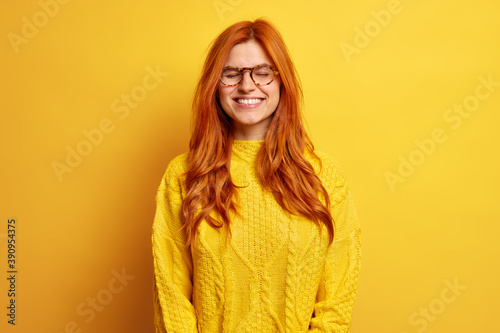 Joyous pretty woman with red hair closes eyes stands satisfied dressed in casual jumper wears optical glasses recalls somethig very pleasant isolated over yellow background. Happy emotions concept