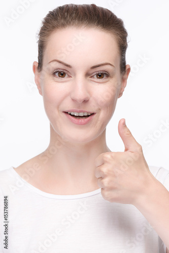 Junge fröhliche hübsche Frau zeigt Daumen hoch