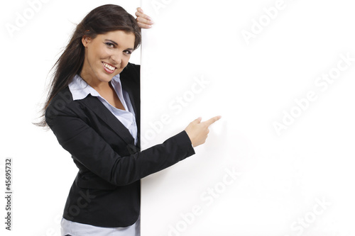 Junge hübsche Frau zeigt auf leeres Plakat