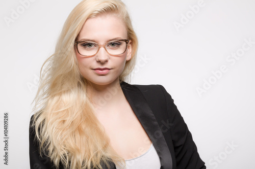 Junge hübsche Geschäftsfrau im Blazer mit Brille
