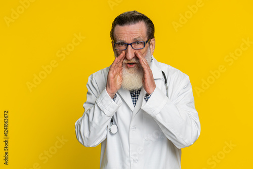Keep my secrets, silence. Elderly doctor cardiologist man whisper news rumors holding hands near mouth share gossip quiet. Grandfather telling interesting confidential information on yellow background