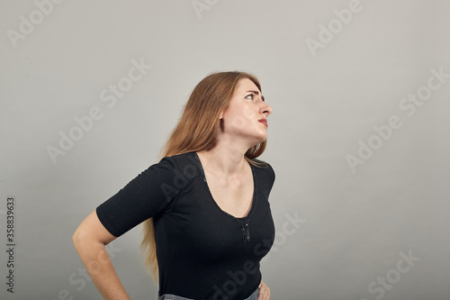 Kidney inflammation, suffering from backache, incorrect posture, scoliosis, pain relief, touch back suffer lower spinal spasm, hurt unhealthy biracial, stretch. Young attractive woman