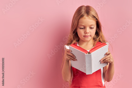 Knowledgeable caucasian girl 5-6 years old reading book, stand isolated on pink background. Attentive reading