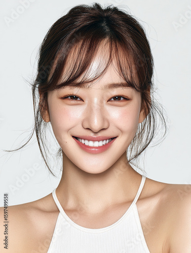 Korean Beauty Model for Skincare and Cosmetic Advertisement, Korean K-Beauty Model in Simple Outfit for Skincare and Cosmetic Stock Photo