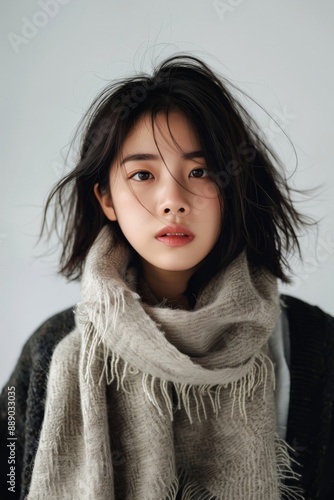 Korean woman wearing a scarf looking stylish white 052 woman, beauty, fashion, winter, hair, smile, scarf, face, child, sweater, people, person, smiling, brunette, cold, model, teen, one, eyes, expre