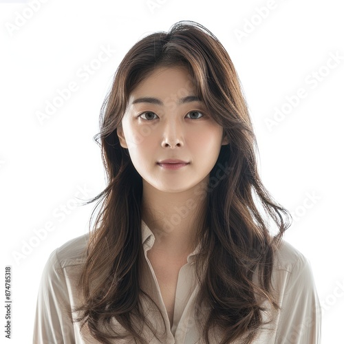 Korean woman with layered long hair, wearing a casual blouse, looking natural, Portrait half-body, hyper-realistic, high detail, photorealistic, white background, studio lighting, Key Light, Fill