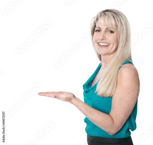 Lachende Blondine präsentiert ein Produkt: Handfläche