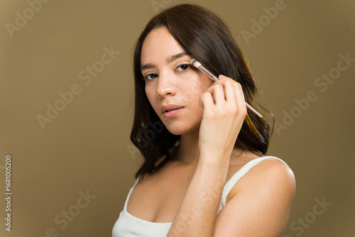 Latin woman applying makeup with brush in studio setting