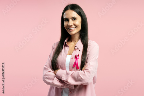 Latin woman wearing pink ribbon with crossed arms showing support for breast cancer awareness