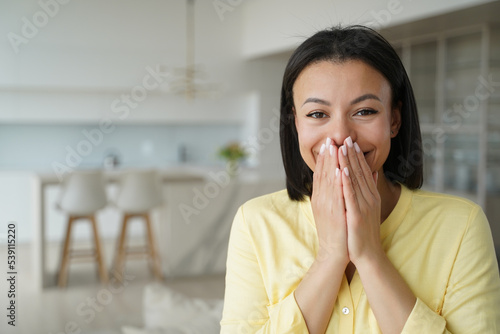 Laughing female covers mouth with hands, giggling at funny joke, gossiping, happy with news at home