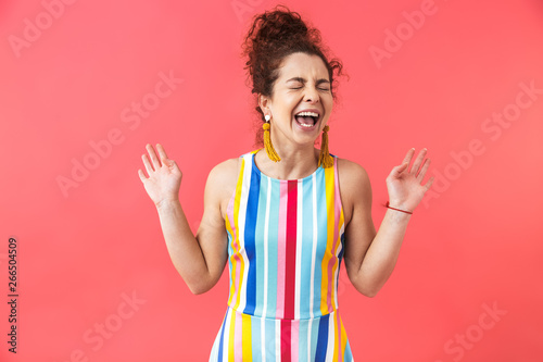 Laughing redhead woman in dress having fun with closed eyes