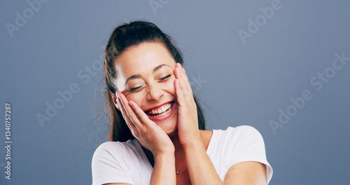 Laughing, smile and face of woman in studio for comic, funny and silly with mockup space. Happiness, meme and comedy with female person on blue background for joke, humor and giggle reaction