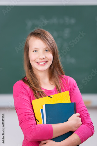 lächelnde schülerin mit unterlagen im klassenzimmer