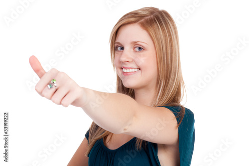 lächelndes mädchen zeigt daumen hoch