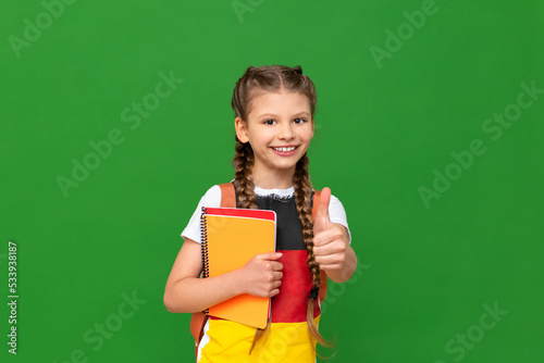 Learning German at school. Foreign language courses in Germany. A schoolgirl with the image of the German flag on a T-shirt with notebooks in her hands and on an isolated background.