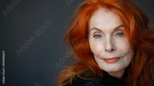 legant older woman with long red hair, wearing a black top, looking thoughtfully at the camera. Emphasizes beauty, wisdom, and individuality. copy space