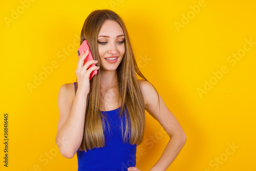 Lifestyle Concept - Portrait of beautiful Caucasian joyful woman talking on mobile phone with friend. Yellow pastel studio background. Copy Space.