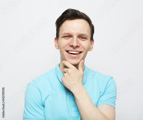 Lifestyle, emotion and people concept: handsome young man smiling and touching his chin over grey background