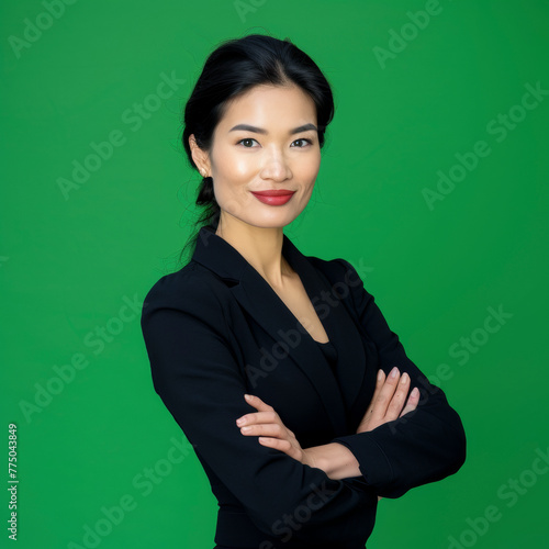 lifestyle photo Happy, arms crossed and portrait of woman on green screen for confident, fashion and elegant Asian American.