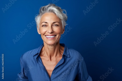 Lifestyle portrait photography of a glad mature woman wearing a casual short-sleeve shirt against a sapphire blue background. With generative AI technology