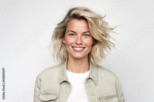 Lifestyle portrait photography of a pleased woman in her 30s that is placed against a white background . Generative AI