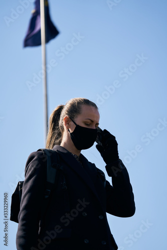 Light-skinned blonde girl in a black protective mask on her face, flag waving in the background