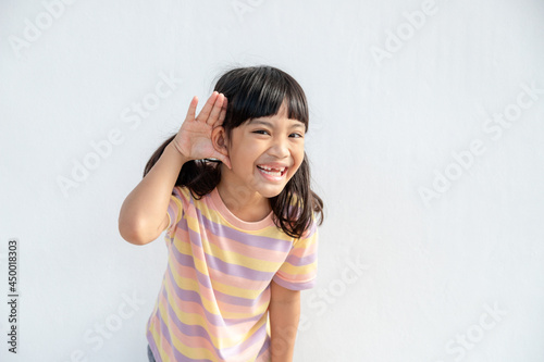 Little Asian girl holds her hand near her ear and listenings. Disability day.Deaf kid. Exciting face on Asian child girl. Turning off the phone and listening to your child.