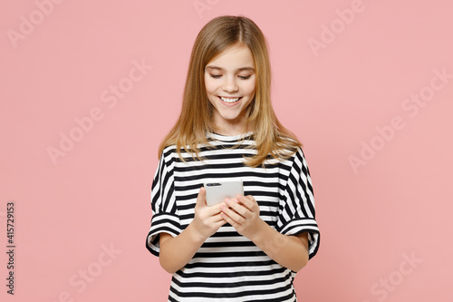 Little blonde smiling kid happy nice girl 12-13 years old wearing striped oversized t-shirt hold mobile cell phone chatting isolated on pastel pink background children. Childhood lifestyle concept.