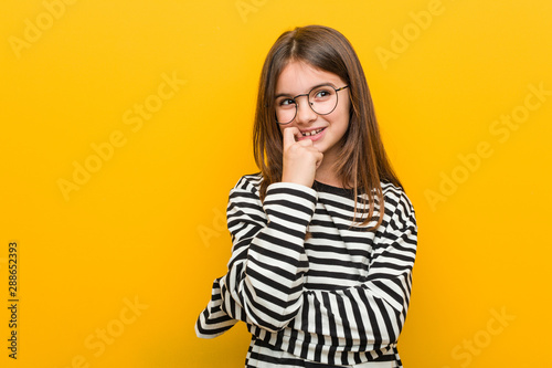 Little caucasian cute girl relaxed thinking about something looking at a copy space.