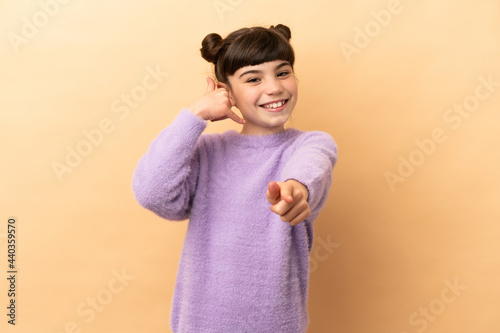 Little caucasian girl isolated on beige background making phone gesture and pointing front
