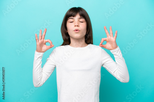 Little caucasian girl isolated on blue background in zen pose