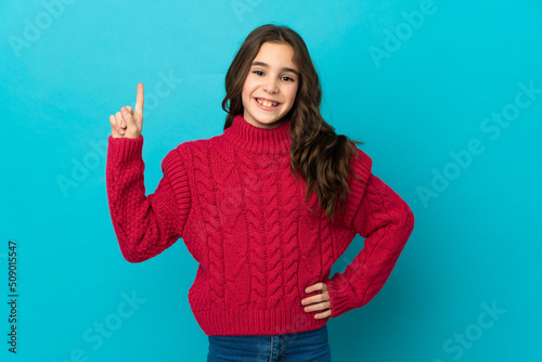 Little caucasian girl isolated on blue background showing and lifting a finger in sign of the best