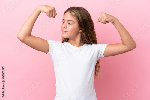 Little caucasian girl isolated on pink background doing strong gesture