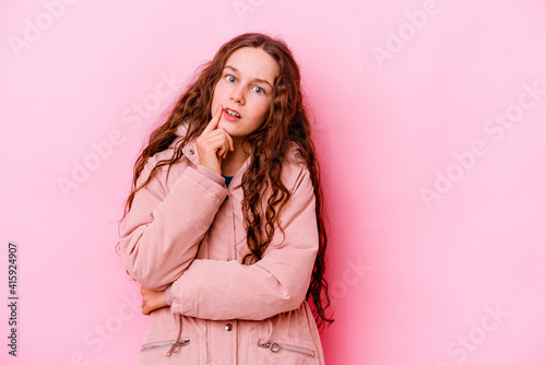 Little caucasian girl isolated on pink background looking sideways with doubtful and skeptical expression.